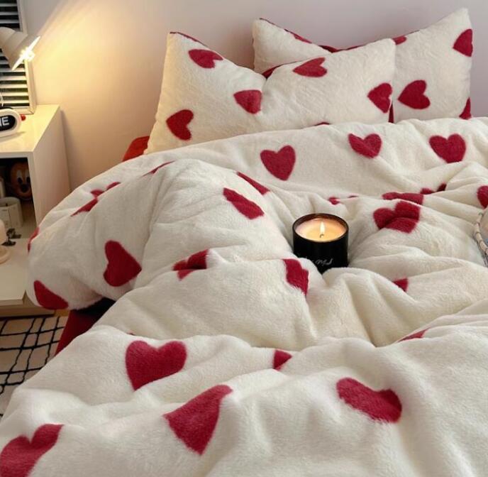 布団カバーセット 可愛いハート柄 厚手 暖かい 子供 大人 高級感 フェイクファー ふわふわ シングル ダブル クイーン フランネル 3点セット 掛け布団カバー フラットシーツ ボックスシ 4点セット