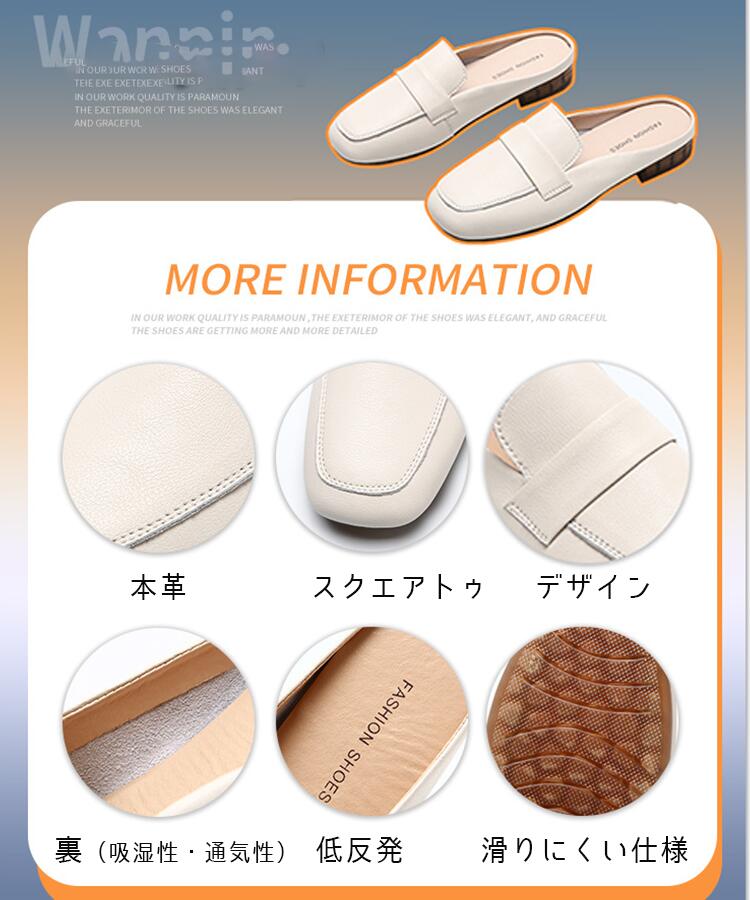 本革 ミュール スクエアトゥ フラットシューズ レディース 春 夏 サンダル レザー 軽量 スリッパ 軽い ローヒール ぺたんこ リゾート ナチュラル 歩きやす 痛くない