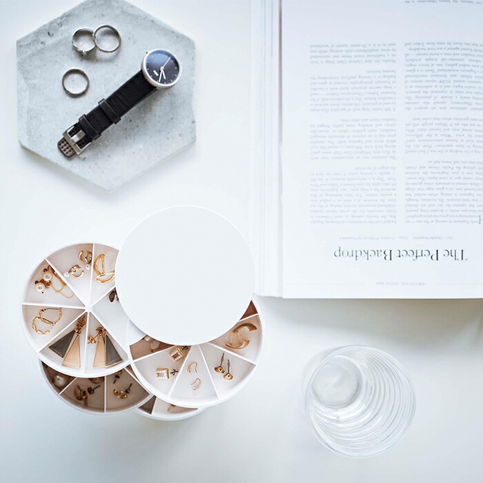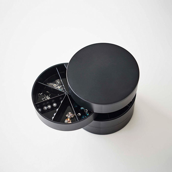 取り出しがスムーズな回転式トレー。小物を探す際に一段ずつ開いて、閉じてを繰り返す必要が無いので、朝の忙しい時間帯にもパッと欲しいアイテムが見つけられて便利です。