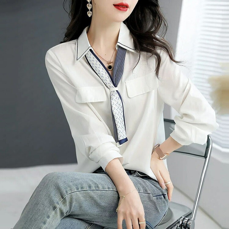 Vネックリボンシャツ ブラウス シャツ トップス 長袖 レディース 春 秋 シンプル お洒落 カジュアル オシャレ 韓国ファッション 大人 人気 トレンド