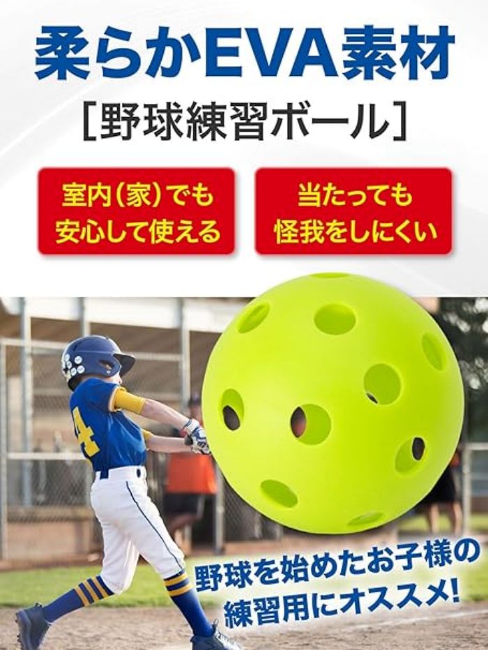 【室内でも安心して使える素材のボール】EVA素材は軽くて柔らかいのが特徴。軽いので飛びづらく、穴を開け空気抵抗を増やすことで勢いが弱まり怪我をしにくい仕様となっており、場所を選ばず安心してお使いいただけます。