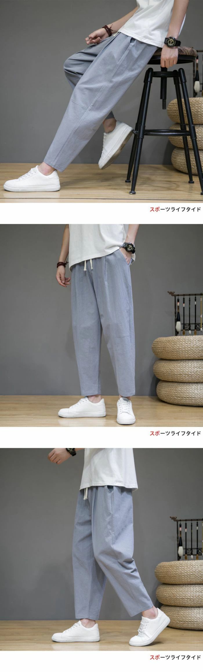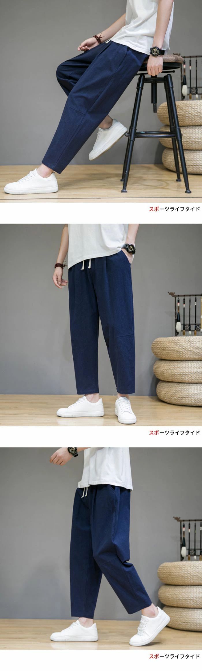 ゆったりとしたシルエットで、窮屈感がなく着回し力が抜群です。カジュアルシーンから部屋着まで、幅広く活躍してくれる九分丈ズボンです。