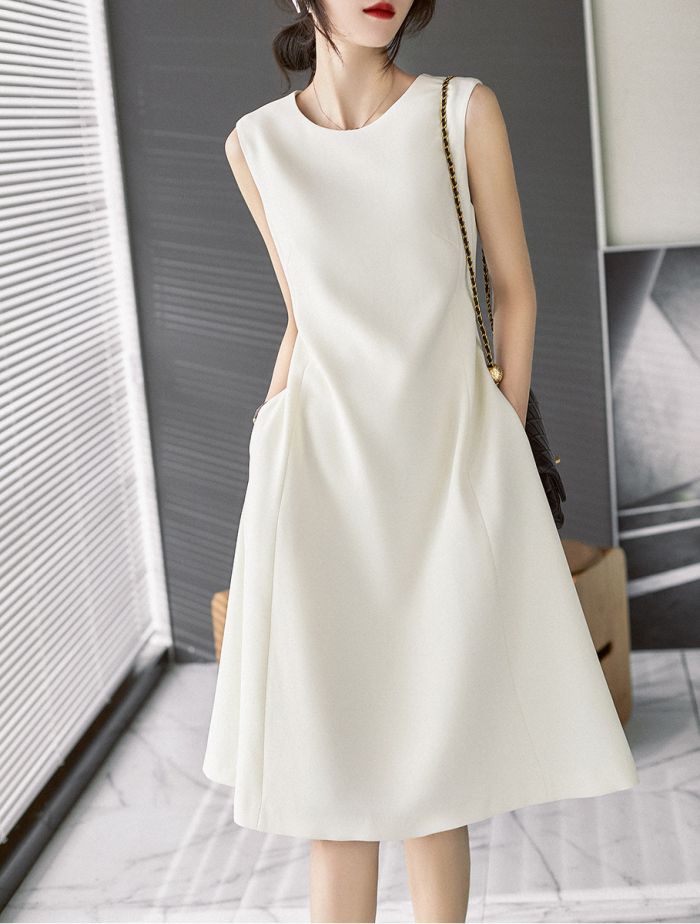 ワンピース ノースリーブ レディース シンプル ドレス 膝丈 Aライン 上品 着痩せ パーティー 無地 発表会 結婚式 ブラック 黒 ホワイト 白 20代 30代 40代 50代 S M L 60代