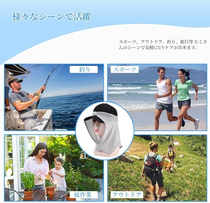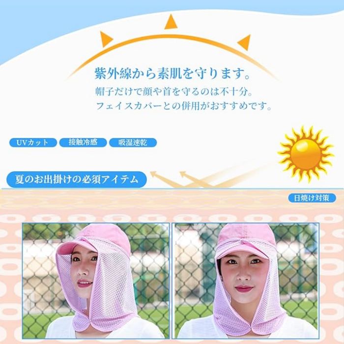 【紫外線から素肌を守る】紫外線をブロックし、マスク類より息が苦しくないです。帽子だけで顔や首を守るのは不十分。フェイスカバーとの併用がおすすめです。