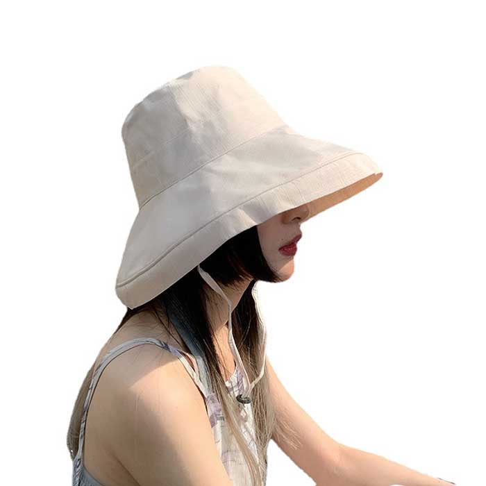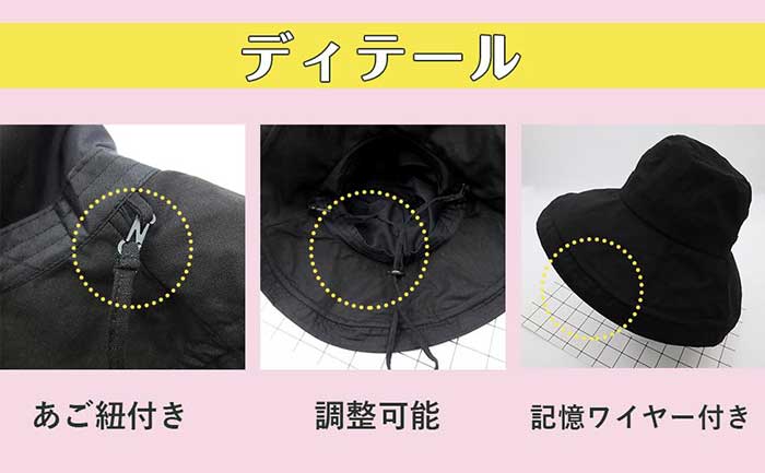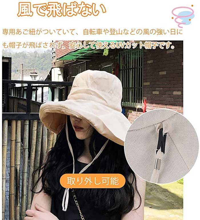 【風で飛ばない】:専用あご紐がついていて、自転車や登山などの風の強い日にも帽子が飛ばされず、安心して使えるUVカット帽子です。