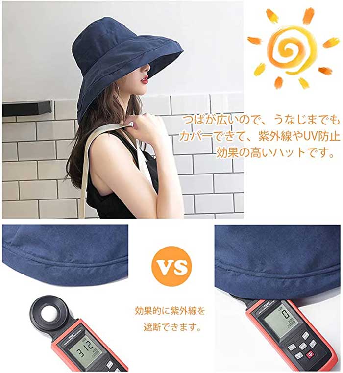 【紫外線対策】:紫外線保護指数UPF50+で春夏の強い日差しを遮り、目や肌をしっかり守ります。つばが広いので、うなじまでもカバーできて、紫外線やUV防止効果の高いハットです。
