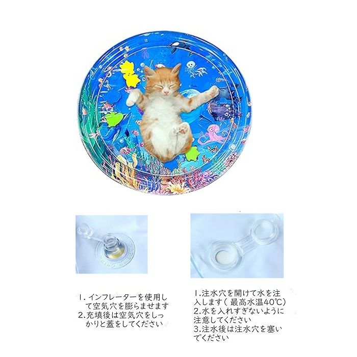 冷却アドベンチャー:仕様: 商品名:猫用感覚水プレイマット 製品材質:PVC 製品サイズ: 直径 65 センチメートル/25.59 インチ。 猫用感覚水プレイマットで遊びの時間を革命的にしましょう。ペットに涼しく快適な感覚体験を提供することで、ペットのリラクゼーションと快適さが向上し、遊びの時間がより楽しくなります。