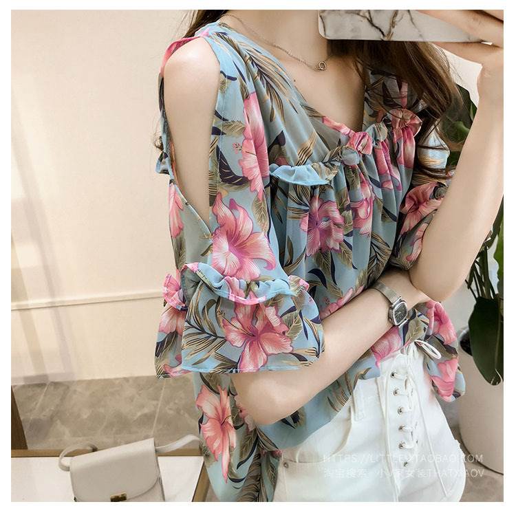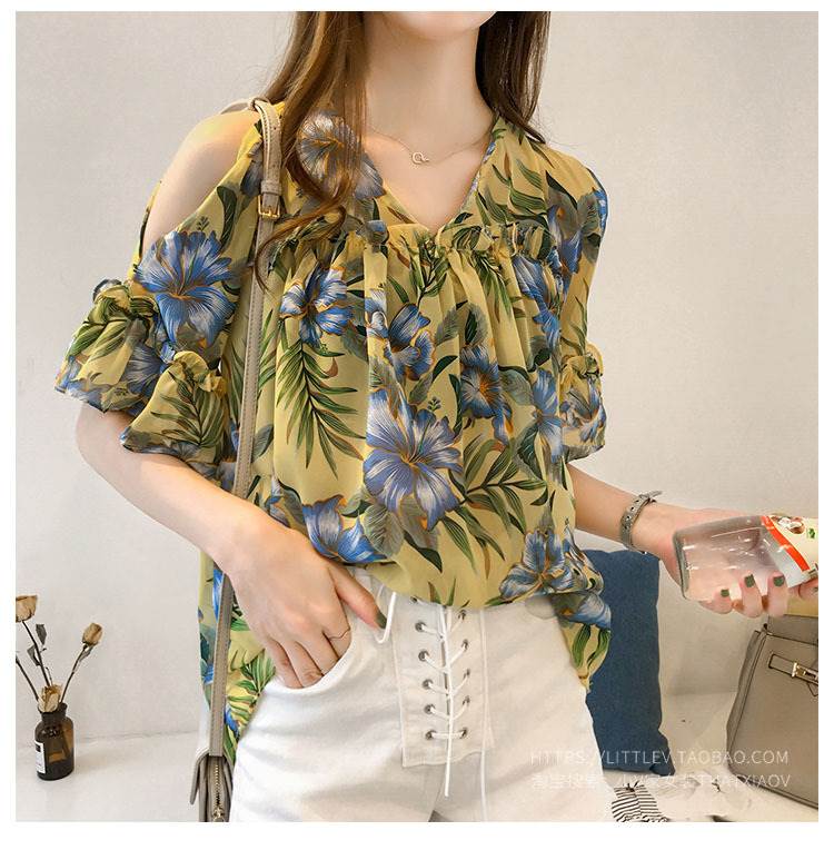 3色カラバリ、ハイビスカス柄肩出し半袖ブラウス。