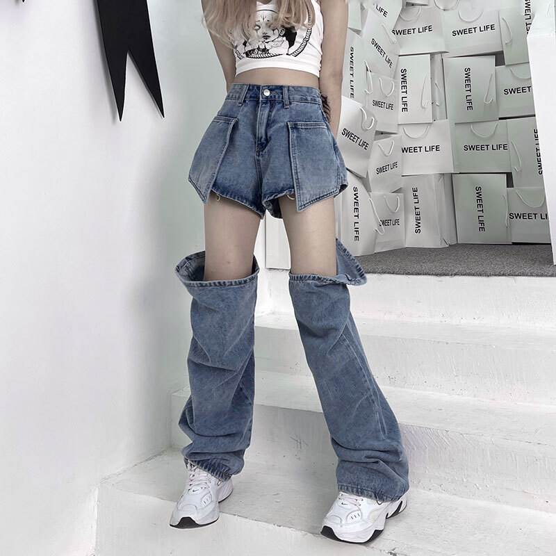 パンツ レディース デニム ショートパンツ レッグウォーマー 2way 取り外し可能 個性的 ハイウエスト 青 XS S M L XL 春 夏 秋 おしゃれ クール かっこいい カジュアル 大人可愛い