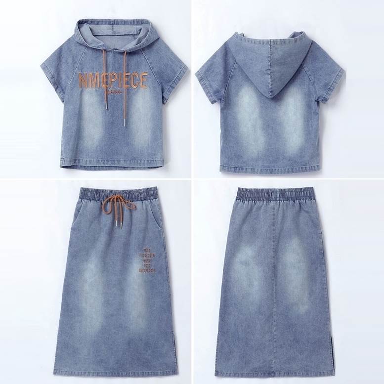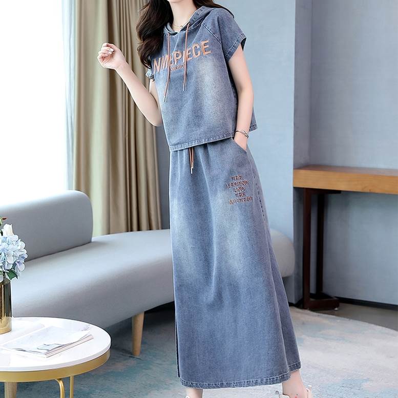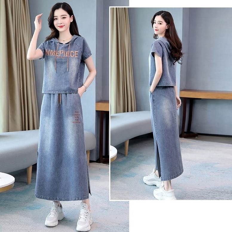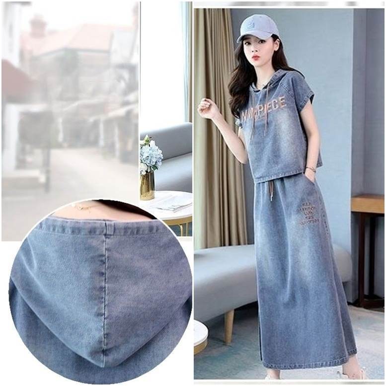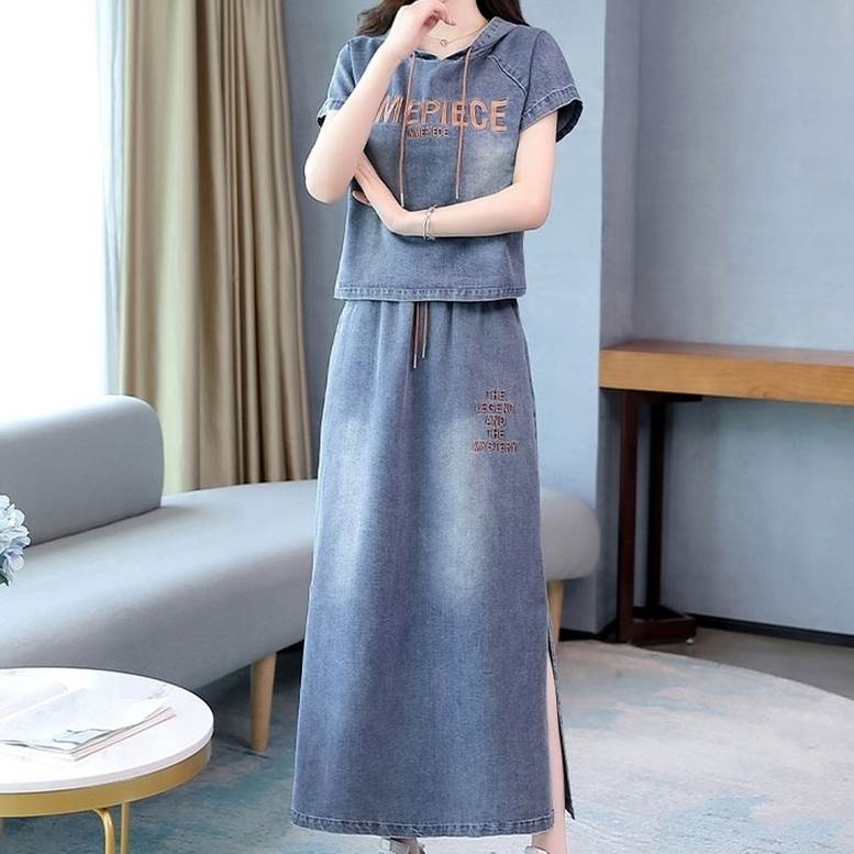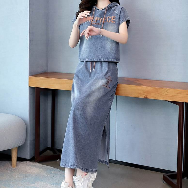 セットアップ デニムシャツ&スカートセット レディース 春 夏 2点セット 上下セット ツーピース デニム パーカー シャツ フード付き Tシャツ 個性的 デニムスカート サイドスリッ ロングスカート