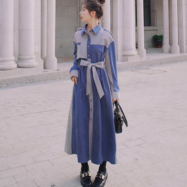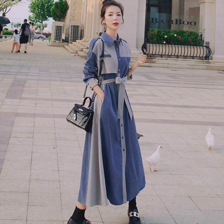 ワンピース シャツワンピ レディース 春 秋 バイカラー ロング丈 フレア 襟付き 長袖 ボタン ウエストリボン 個性的 トレンチ ミモレ丈 大人可愛い きれいめ エレガント フォーマル ガーリ 上品