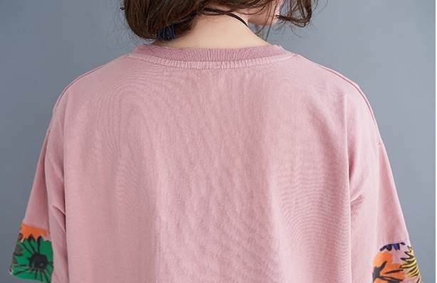 大きいサイズ Tシャツ 花柄 ひまわり レディース 大きめ ゆったり ラフ アジアン スリット 個性的 個性派 レトロ 夏 お洒落 オシャレ ポイント ロング 涼しい 涼しげ カジュアル 向日葵 ヒマワリ 体型カバー ラウンドネック くすみカラー 30代 40代 50代 半袖 5分袖 かわいい 大人可愛い