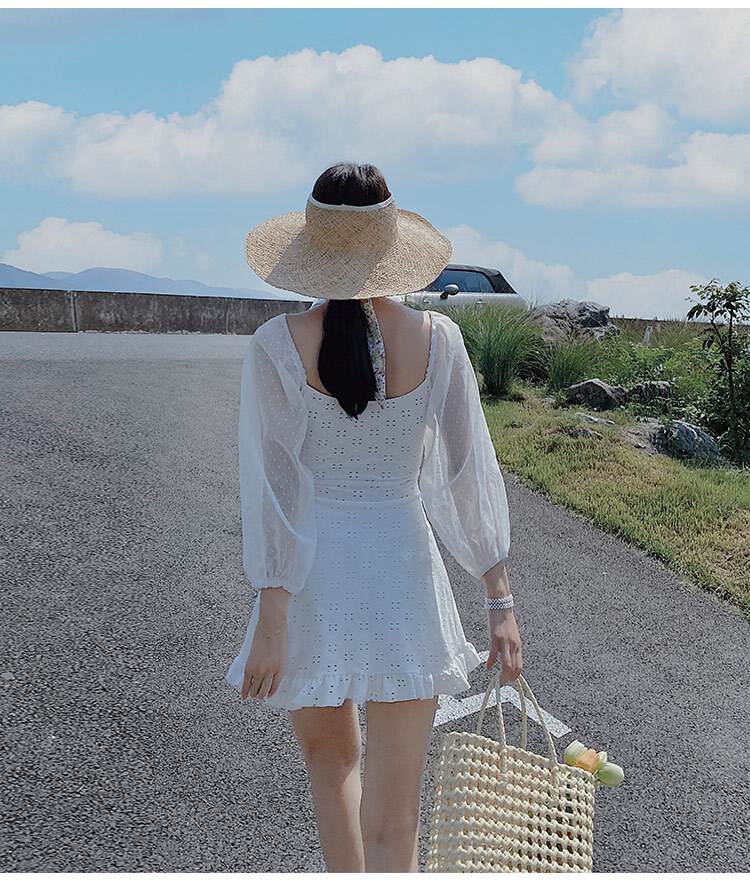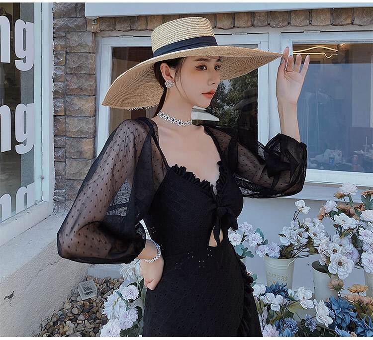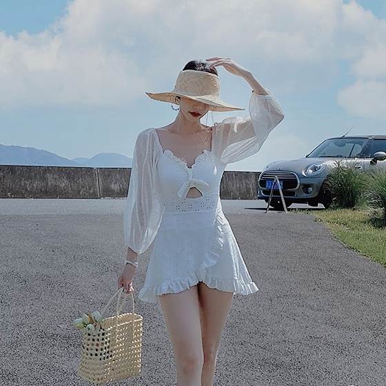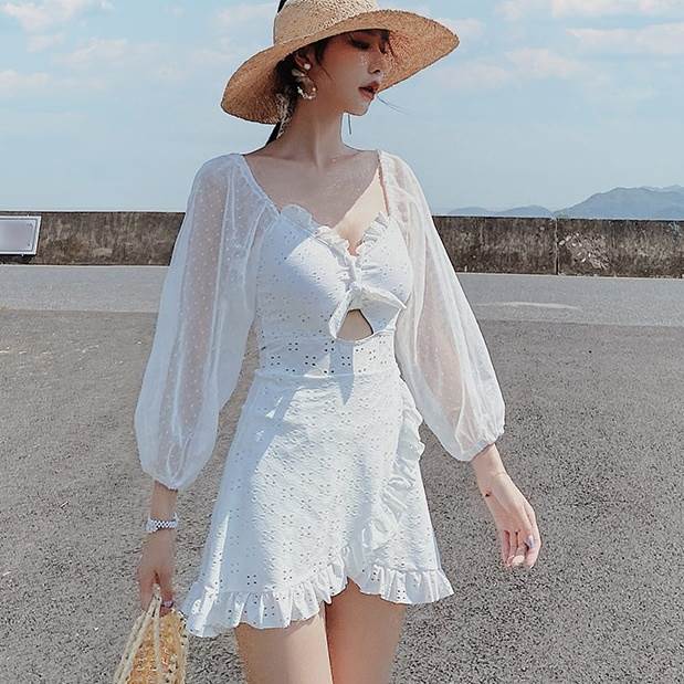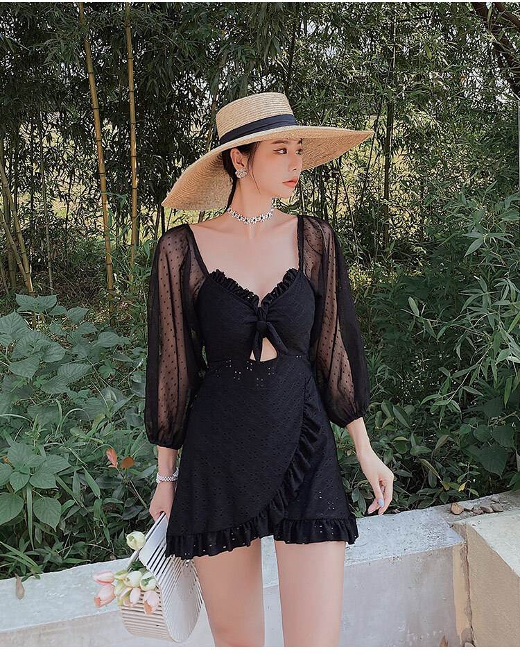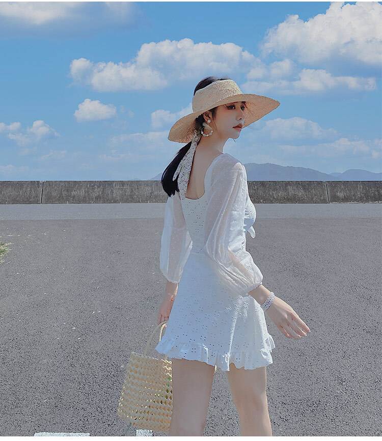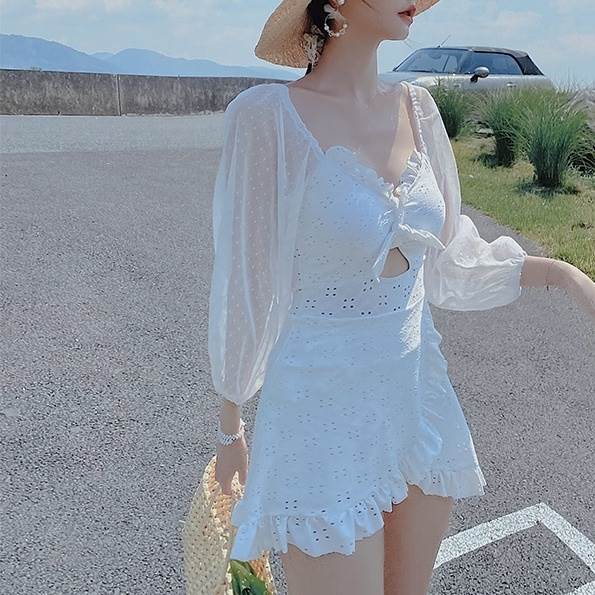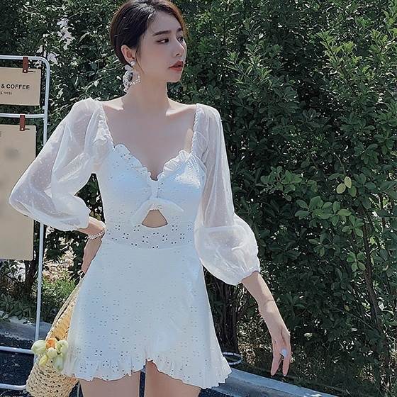 水着 ワンピース 2色 長袖 フリル レース レディース シフォン 透け感 パフスリーブ 韓国 トレンド 流行 シアー 肌見せ 学生 ОL スクール 海 海水浴 白 ホワイト ブラッ ビーチスイミング