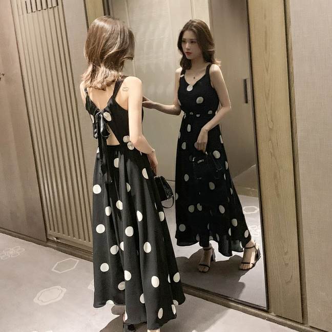 ワンピース レディース フレア 個性的 ロング アンクル丈 ドット 柄 リボン 黒 白 L XL 2XL 3XL 4XL 大きいサイズ 春 夏 秋 レトロ フェミニン おしゃれ 背中見せ 体 ガーリー