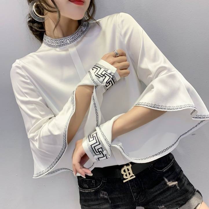 トップス レディース ブラウス チャイナ風 個性的 ワイド フレア袖 ボトルネック 無地 白 黒 S M L XL 2XL 3XL 大きいサイズ 春 夏 秋 上品 おしゃれ シンプル カジュ きれいめ