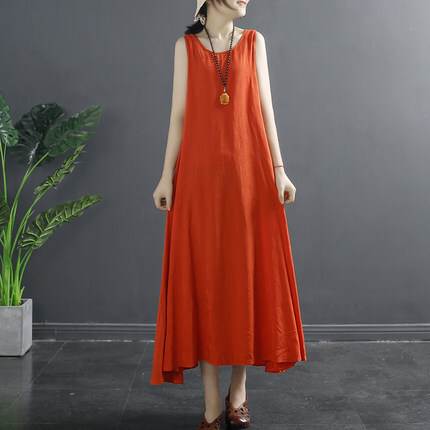 夏 リネン ロングスカート ワンピース ロングスカート ミディスカート ワンピドレス 袖なし ノースリーブ ラウンドネック 襟なし スリム ストレート ふわふわ 伸縮性 個性的 送料無料