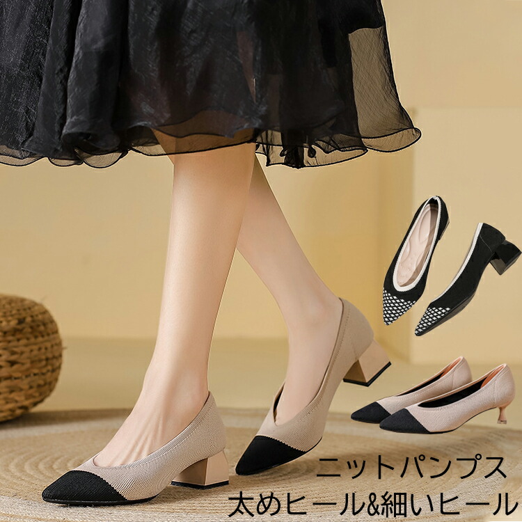 ニットパンプス 靴 パンプス 痛くない 歩きやすい 走れる ポインテッドトゥ 4センチヒール 脱げない フラット シューズ 柔らか ローヒール 低反発 大きいサイズ 22cm~2 バイカラー