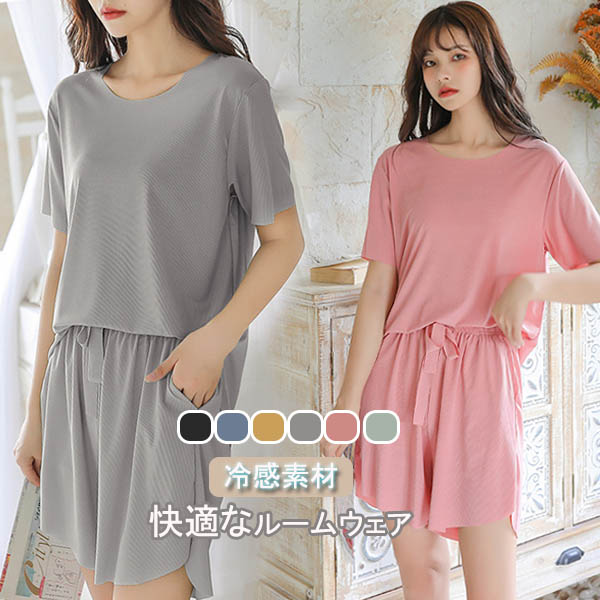 ルームウエア パジャマ セットアップ レディース 上下セット 半袖 接触冷感 涼しい tシャツ ショートパンツ ナイトウェア 夏 2点セット 部屋着 ワイドパンツ カジュアル 無地 パンツ