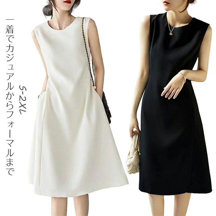 ワンピース ノースリーブ レディース シンプル ドレス 膝丈 Aライン 上品 着痩せ パーティー 無地 発表会 結婚式 ブラック 黒 ホワイト 白 20代 30代 40代 50代 S M L 60代