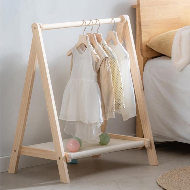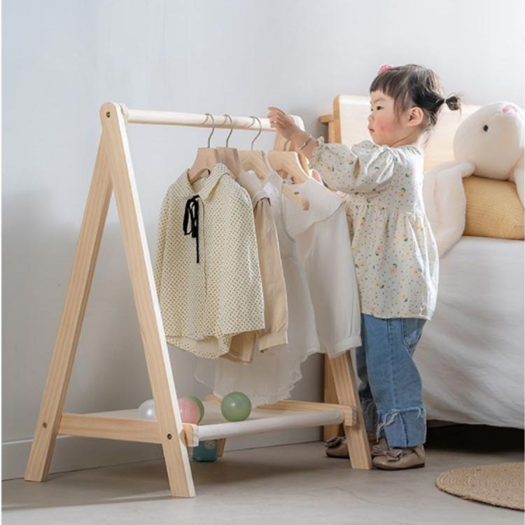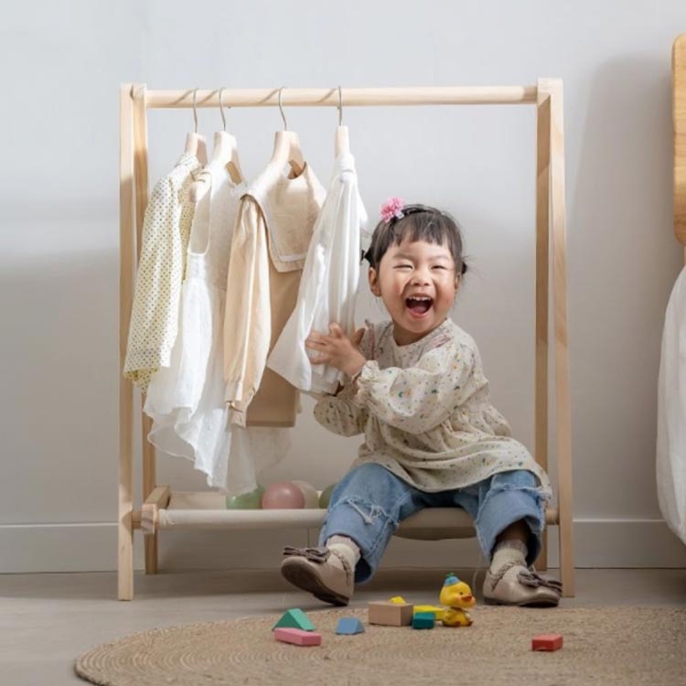 園服や通園グッズがコンパクトに収納できる天然木ハンガーラック。