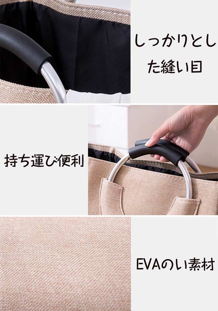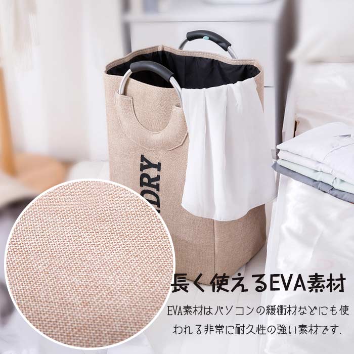 【素材 材質EVAの強い素材で麻風におしゃれに仕上げた洗濯かごになります。耐久性が良くて、丈夫です。軽量なのに、しっかりと自立する丈夫な構成です。