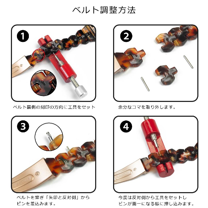 軽量素材のアクリル材質に特性を生かしたべっ甲柄や大理石調をデザインしたとても女性らしいベルトです。ストーン調の8種類のデザインはアクリルの光沢により高級感がとてもあります。またベルトはスリム形状にデザインされていてシックに着こなしが出来て様々なシーンで活躍できるデザインとなっています。今ならベルト調整用の工具もオマケで付いてくるのでベルト調整をしに専門店に持ち込む必要が無くご自身で簡単に調整が出来ます。