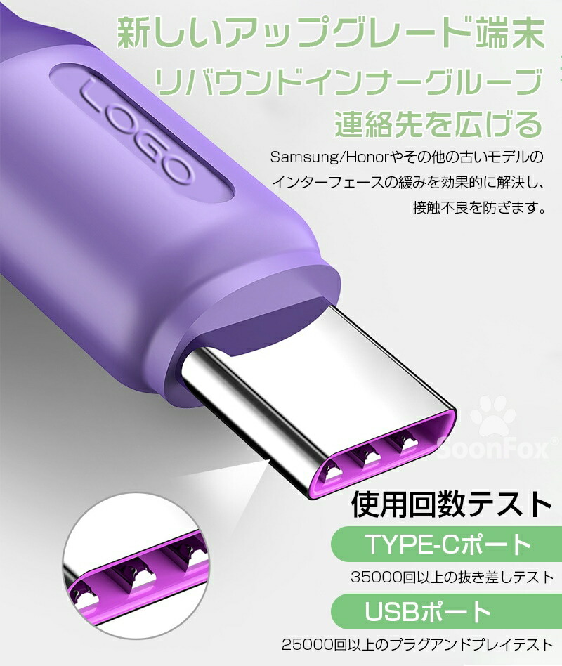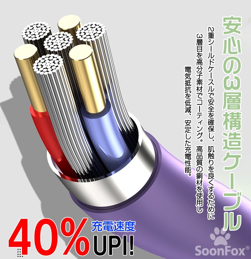 このtypec ケーブルは各種の上質素材を使用した安全重視設計により3Aの高出力を流せしかも過充電と発熱などを防ぎ、安定性の高い急速充電と大切な機器の損傷防止を実現します。