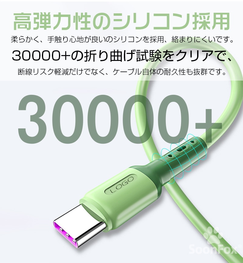 社内での厳正なテスト(1万回以上の抜き差し、2万回以上の折り曲げ)をクリアしています。引っ張り、ねじれに強く、絡まりにくさを兼ね備えたシリコン素材。扱いやすくて耐久性の高いusb type c ケーブルです。