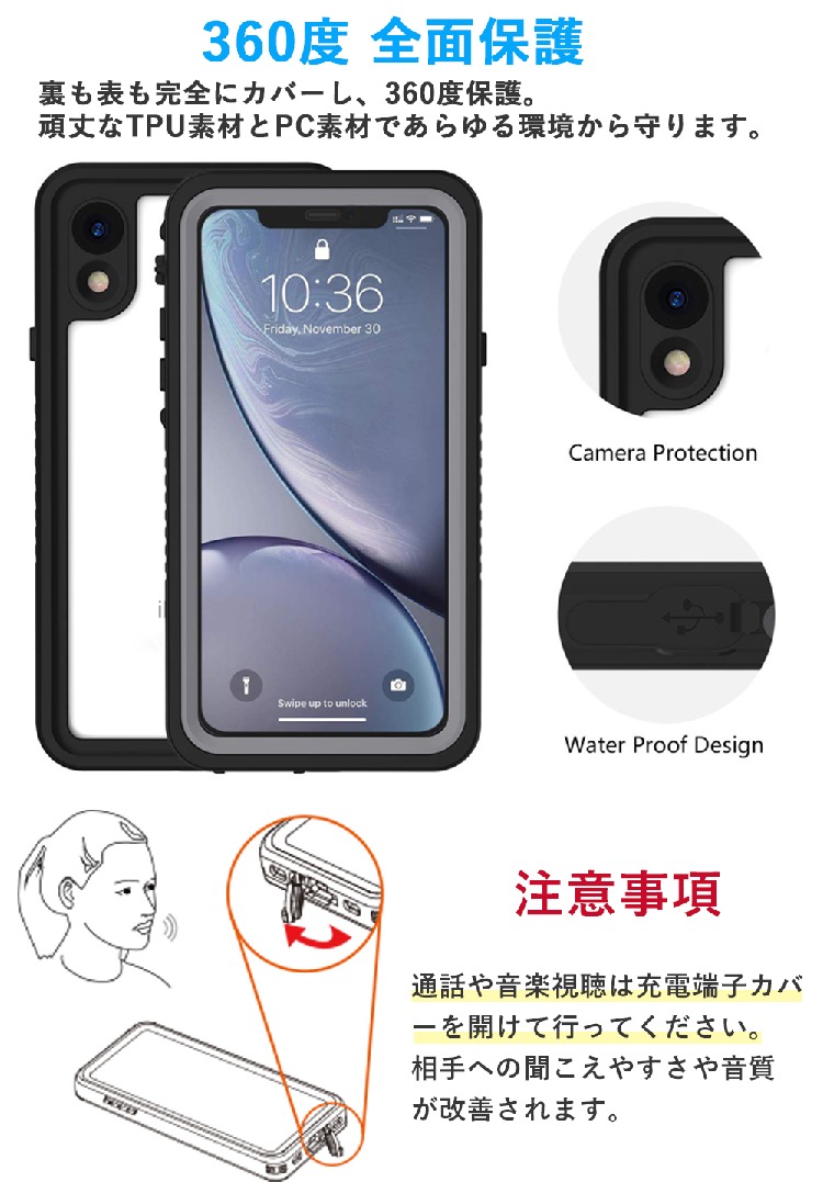 通話や音楽視聴時は充電端子カバーを開けて行ってください。ただし、防水ケースの仕様上、通話には適しておりませんので、あらかじめご了承ください。