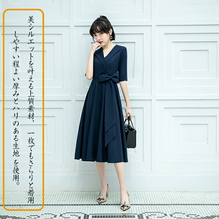 ワンピース レディース 中袖 Aライン 無地 膝下丈 細見え 着痩せ 体型カバー 夏 春秋 シンプル 女性 エレガント ロング xS-3XL ドレス