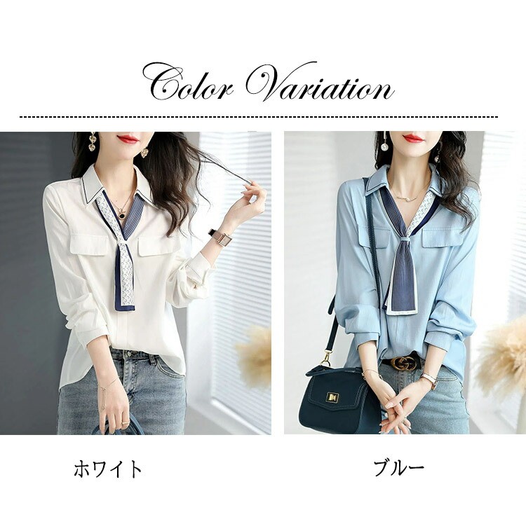 Vネックリボンシャツ ブラウス シャツ レディースファッション 新登場! ホワイト ブルー M L XL