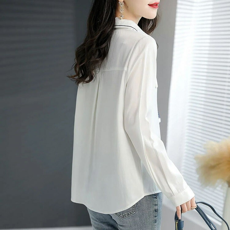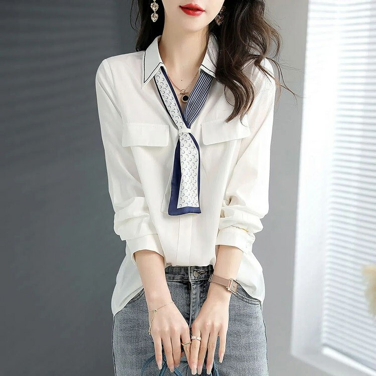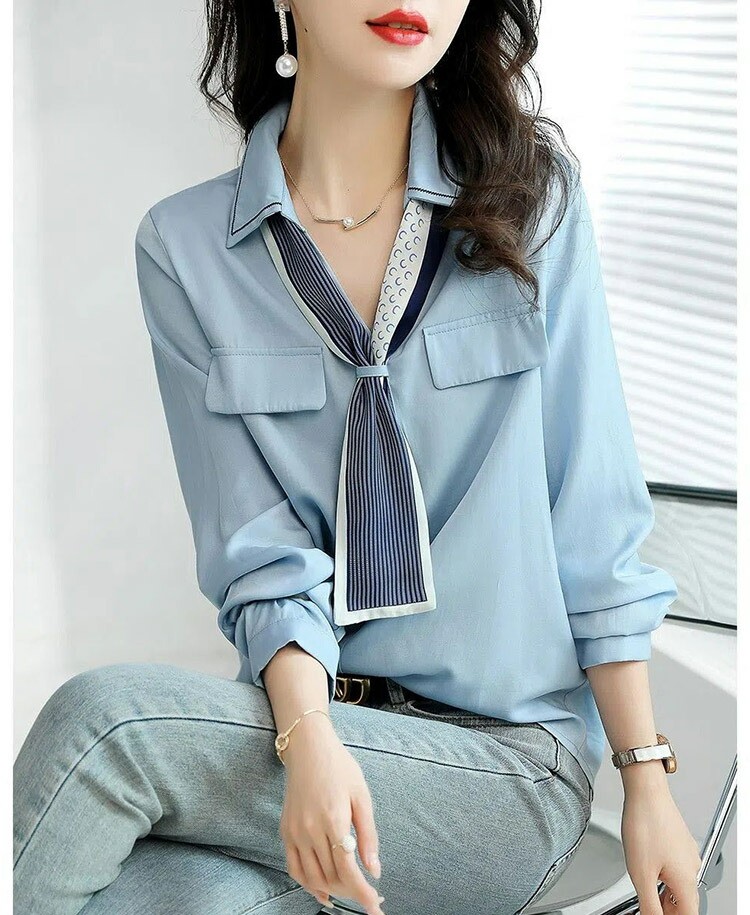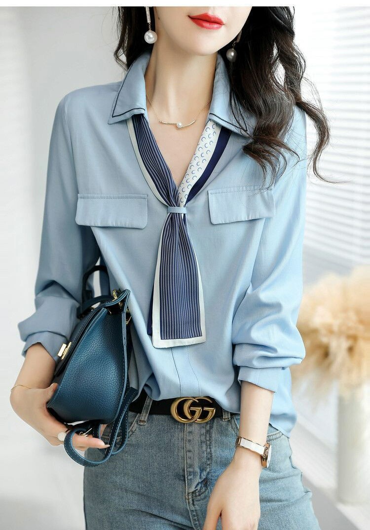 Vネックリボンシャツ ブラウス シャツ トップス 長袖 レディース 春 秋 シンプル お洒落 カジュアル オシャレ 韓国ファッション 大人 人気 トレンド
