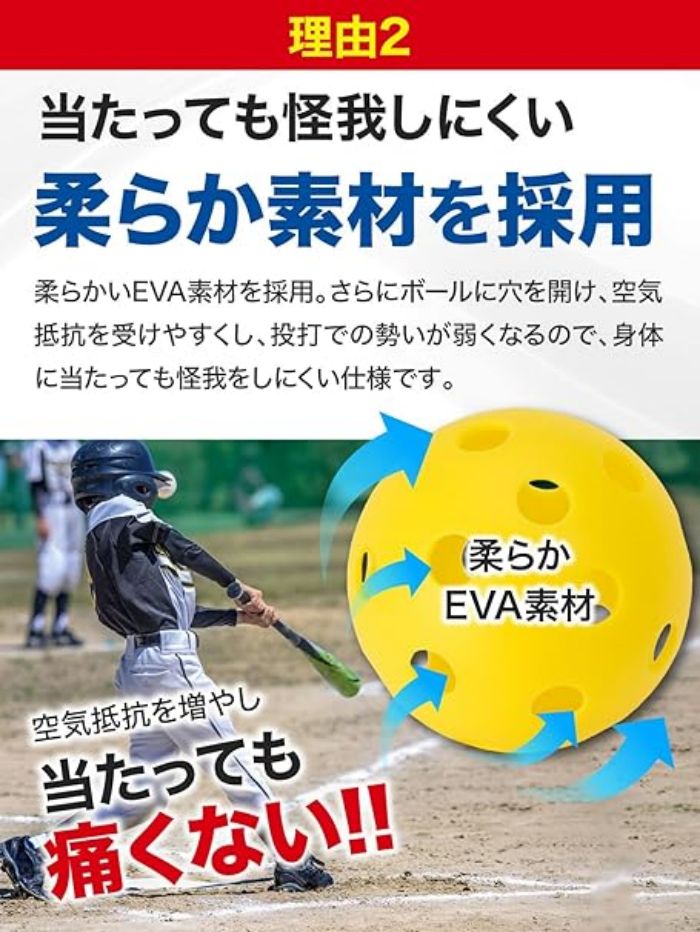 【室内でも安心して使える素材のボール】EVA素材は軽くて柔らかいのが特徴。軽いので飛びづらく、穴を開け空気抵抗を増やすことで勢いが弱まり怪我をしにくい仕様となっており、場所を選ばず安心してお使いいただけます。