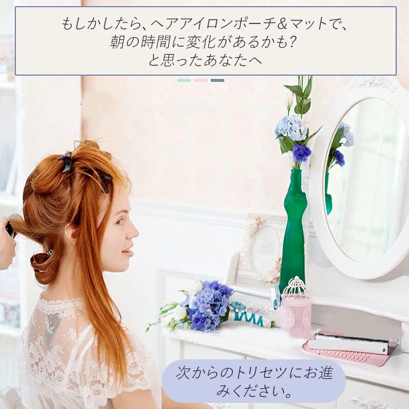 旅行や出張に便利:開いて使えば ヘアアイロンマット になるし、使い終われば ヘアアイロンポーチ になるので、携帯に便利。