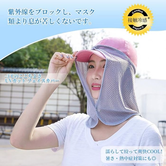 【紫外線から素肌を守る】紫外線をブロックし、マスク類より息が苦しくないです。帽子だけで顔や首を守るのは不十分。フェイスカバーとの併用がおすすめです。