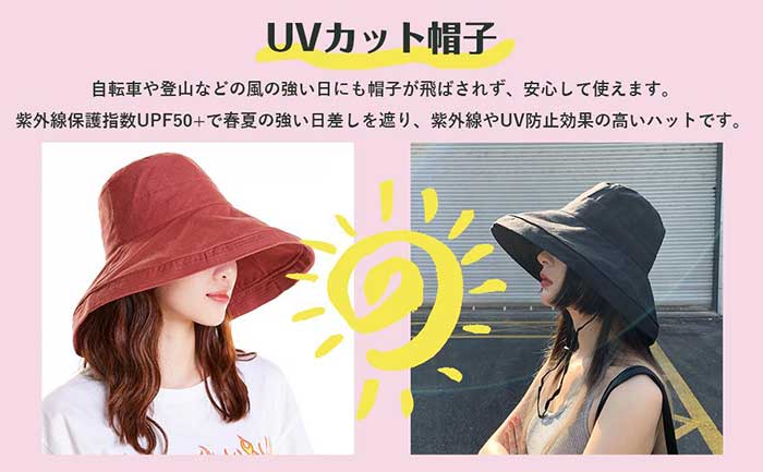 【風で飛ばない】:専用あご紐がついていて、自転車や登山などの風の強い日にも帽子が飛ばされず、安心して使えるUVカット帽子です。