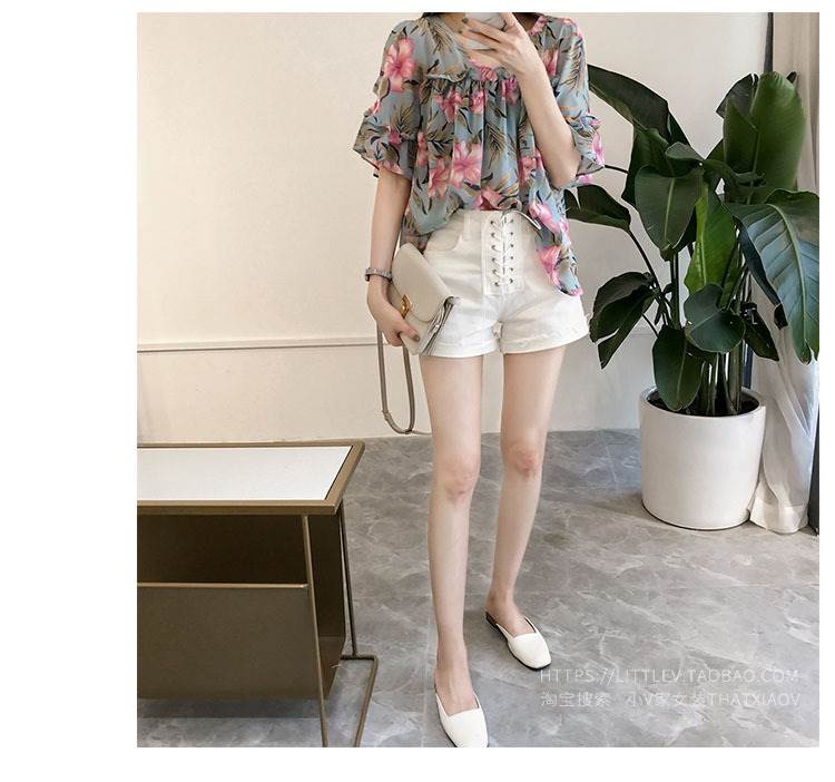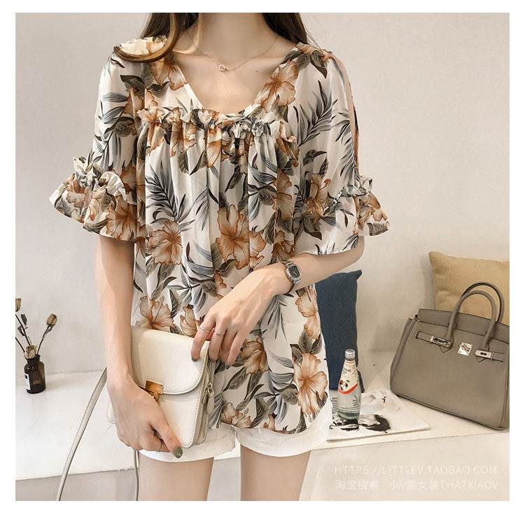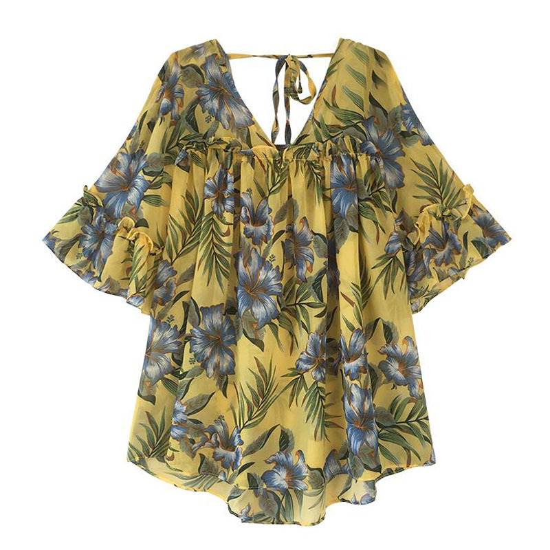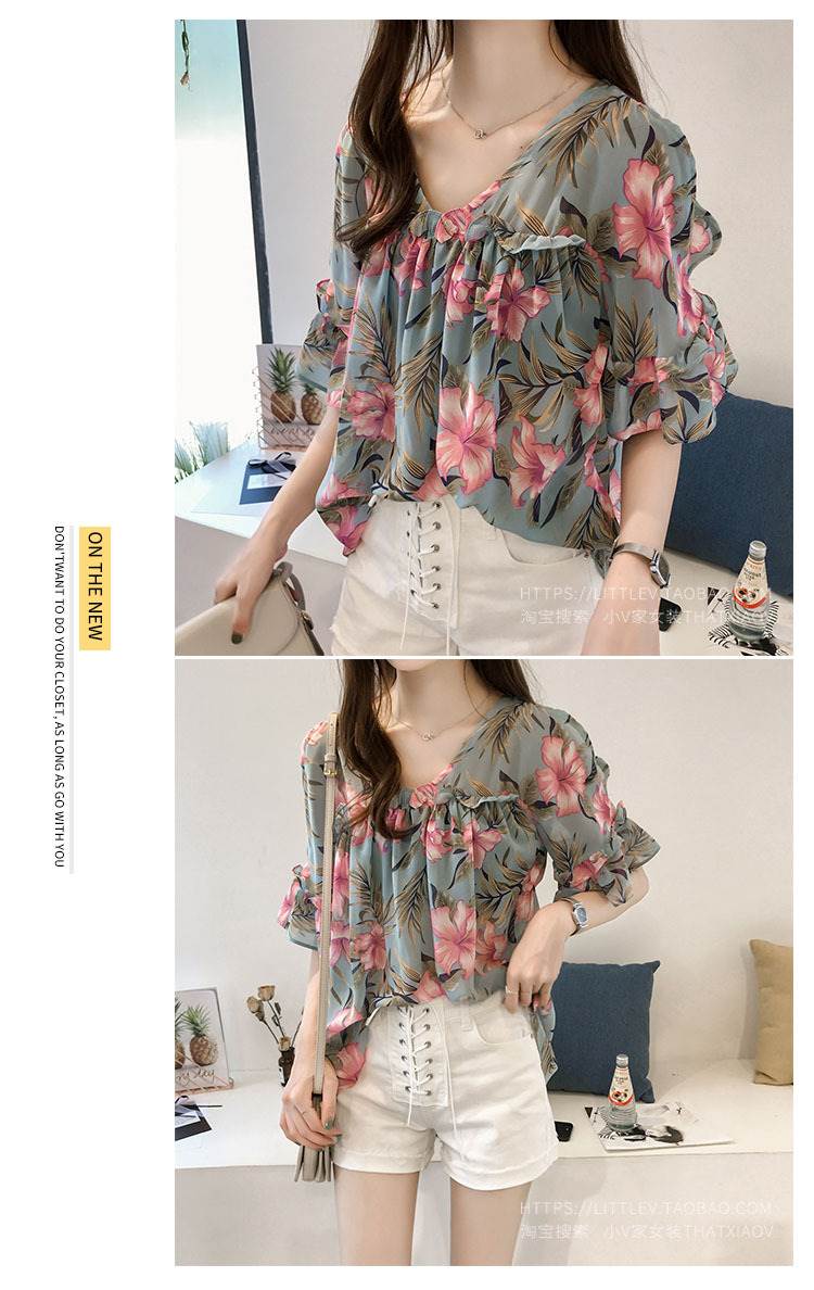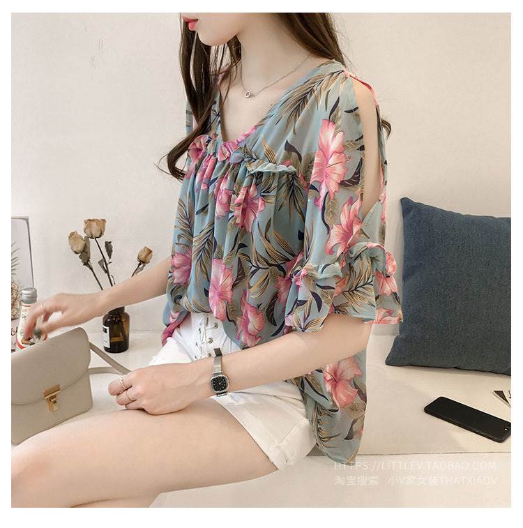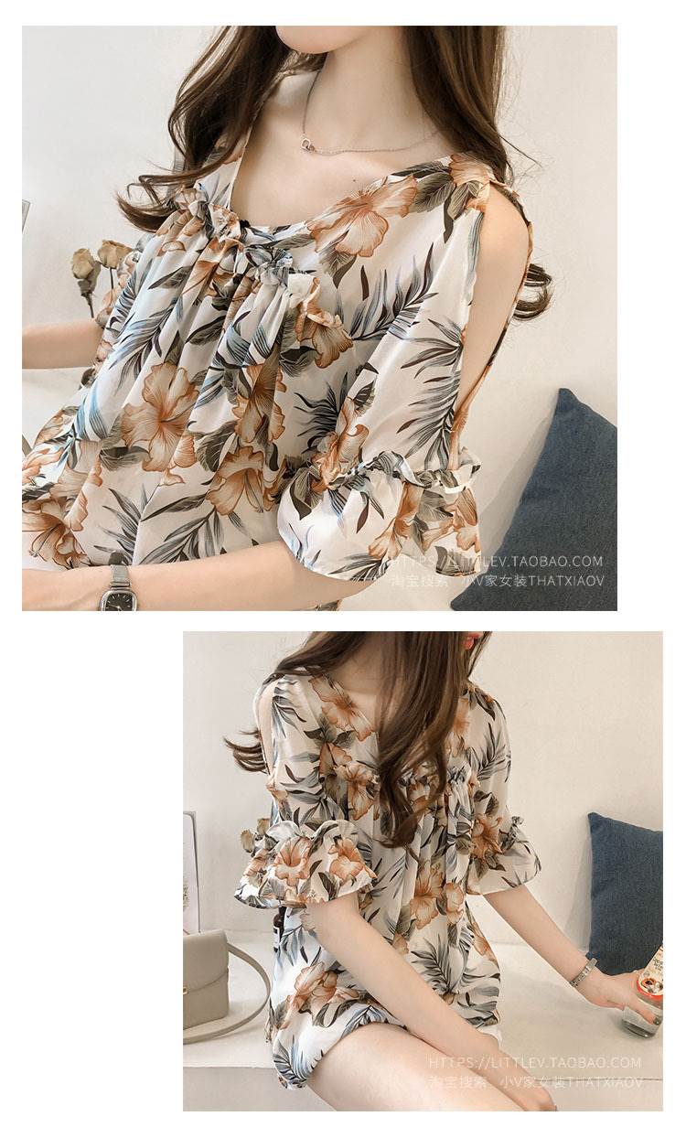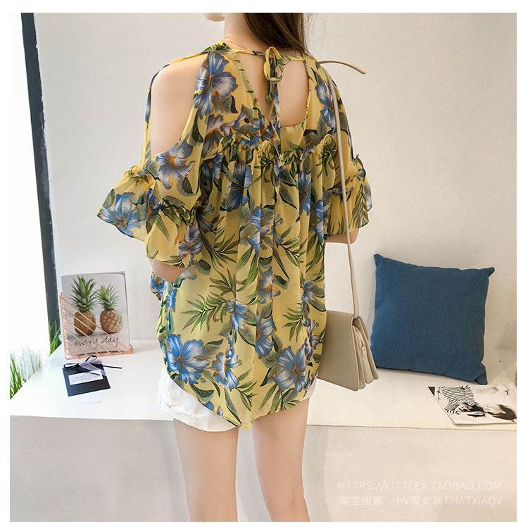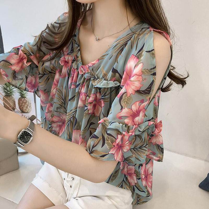 3色カラバリ、ハイビスカス柄肩出し半袖ブラウス。