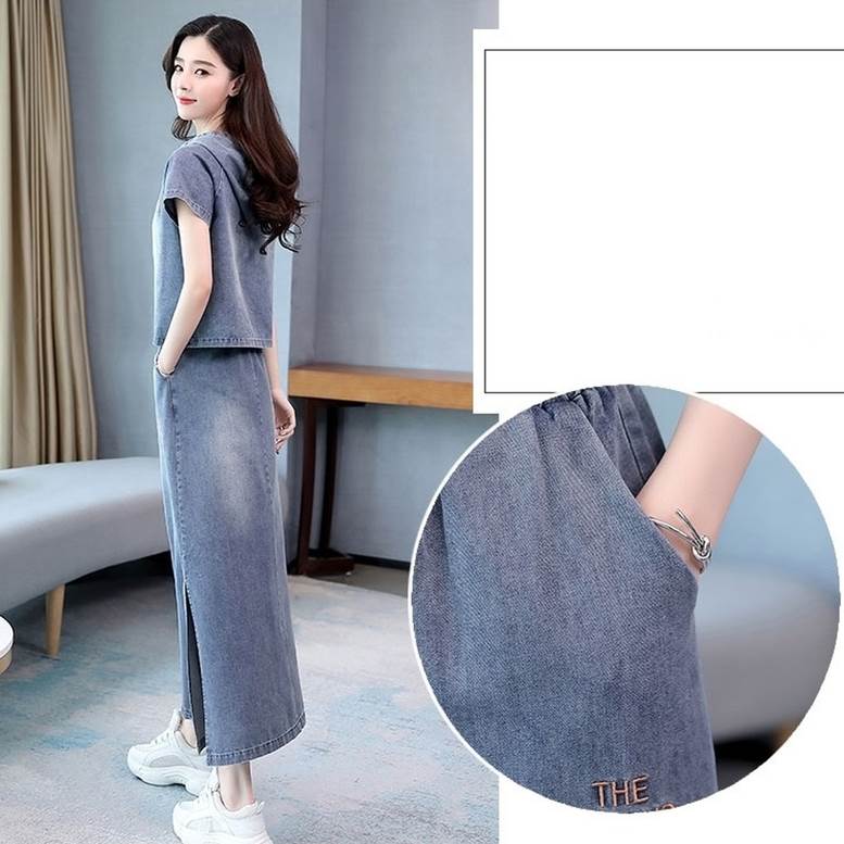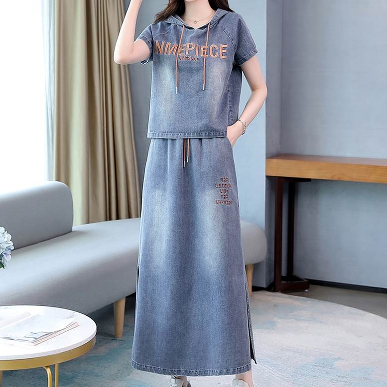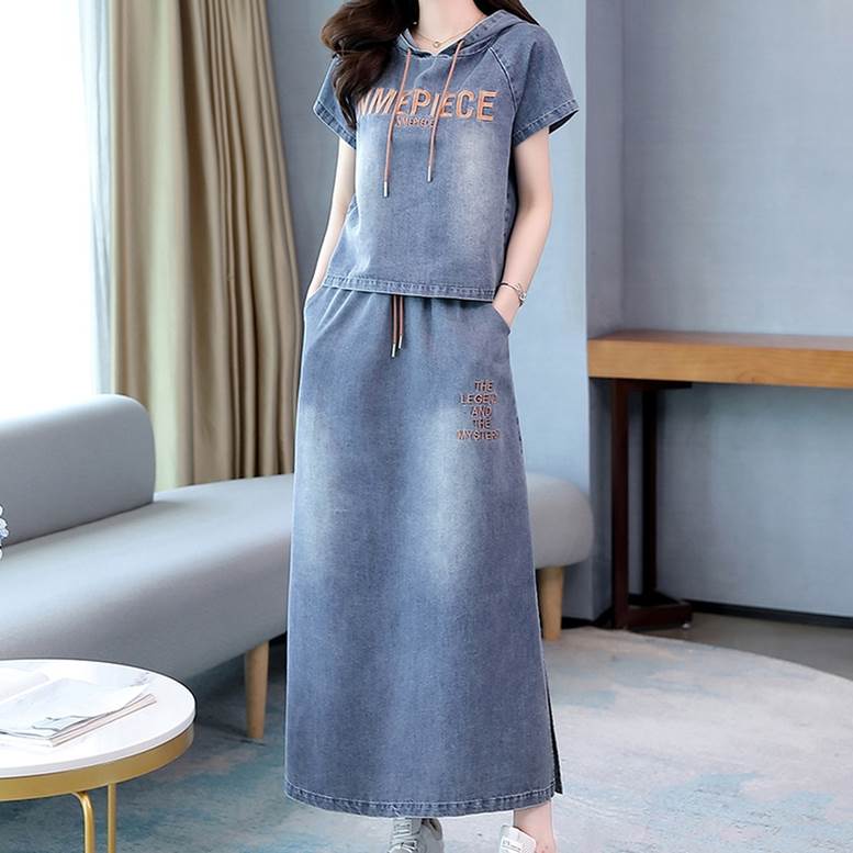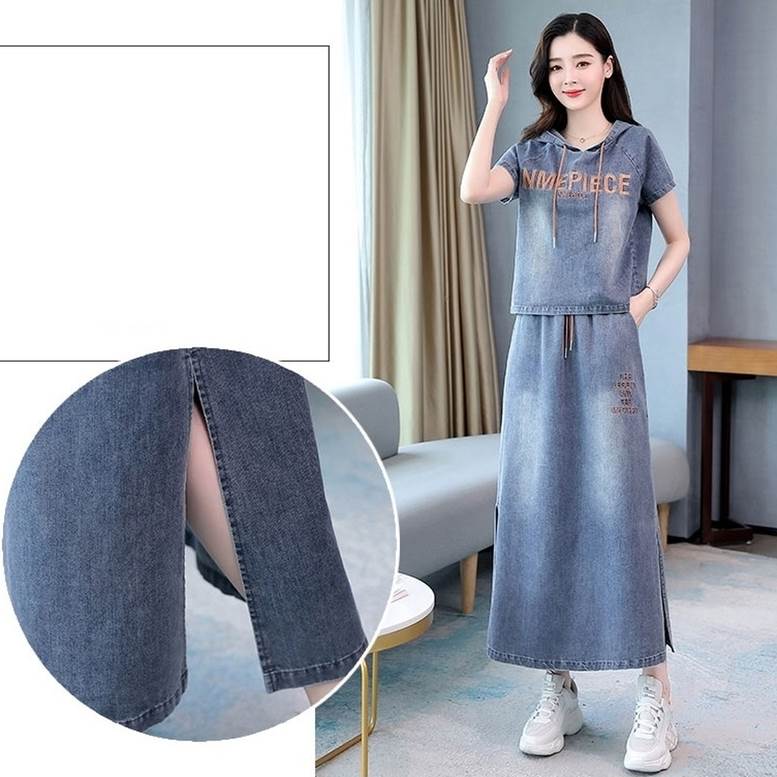 セットアップ デニムシャツ&スカートセット レディース 春 夏 2点セット 上下セット ツーピース デニム パーカー シャツ フード付き Tシャツ 個性的 デニムスカート サイドスリッ ロングスカート