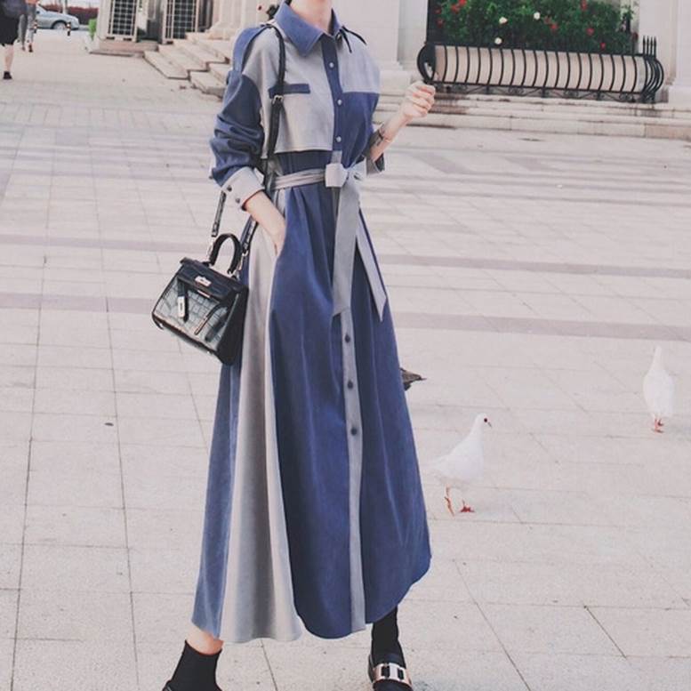ワンピース シャツワンピ レディース 春 秋 バイカラー ロング丈 フレア 襟付き 長袖 ボタン ウエストリボン 個性的 トレンチ ミモレ丈 大人可愛い きれいめ エレガント フォーマル ガーリ 上品