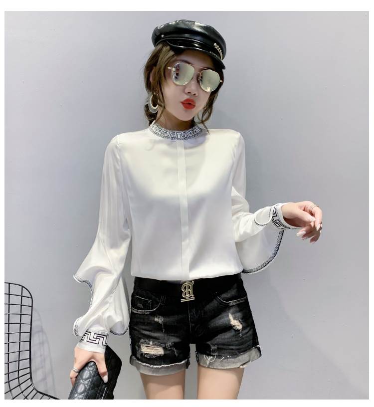 トップス レディース ブラウス チャイナ風 個性的 ワイド フレア袖 ボトルネック 無地 白 黒 S M L XL 2XL 3XL 大きいサイズ 春 夏 秋 上品 おしゃれ シンプル カジュ きれいめ