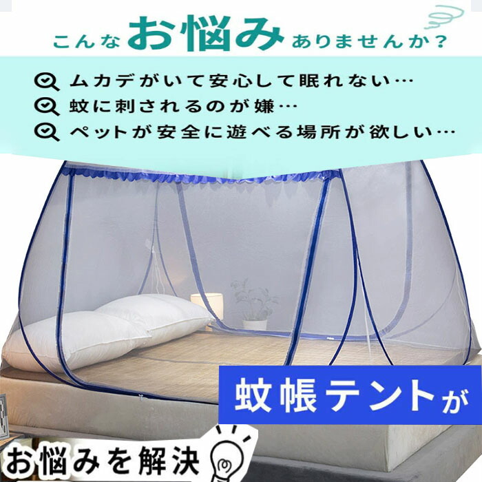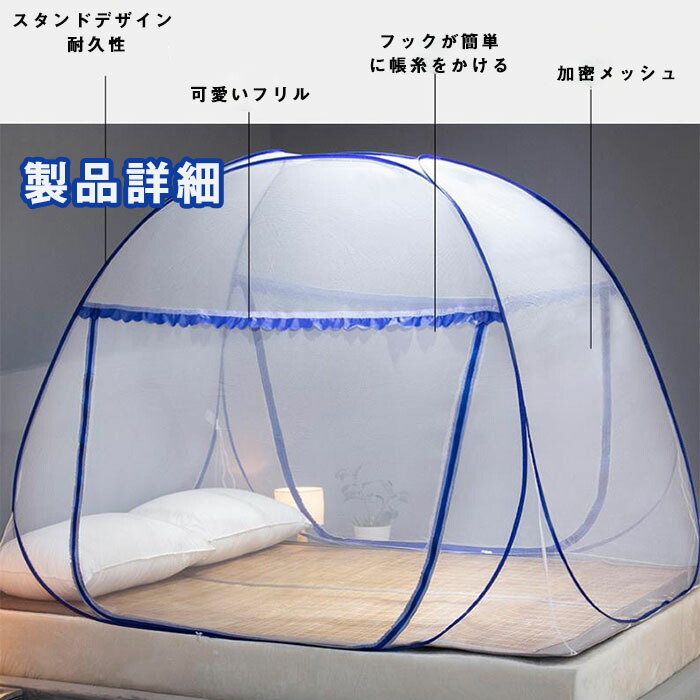 蚊帳 折りたたみ式 ワンタッチ 両面ファスナー ポリエステル 密度が高い 虫よけ 蚊よけ 収納便利 全方位ガード 収納バッグ付き ダブル180×200×150cm ブルー