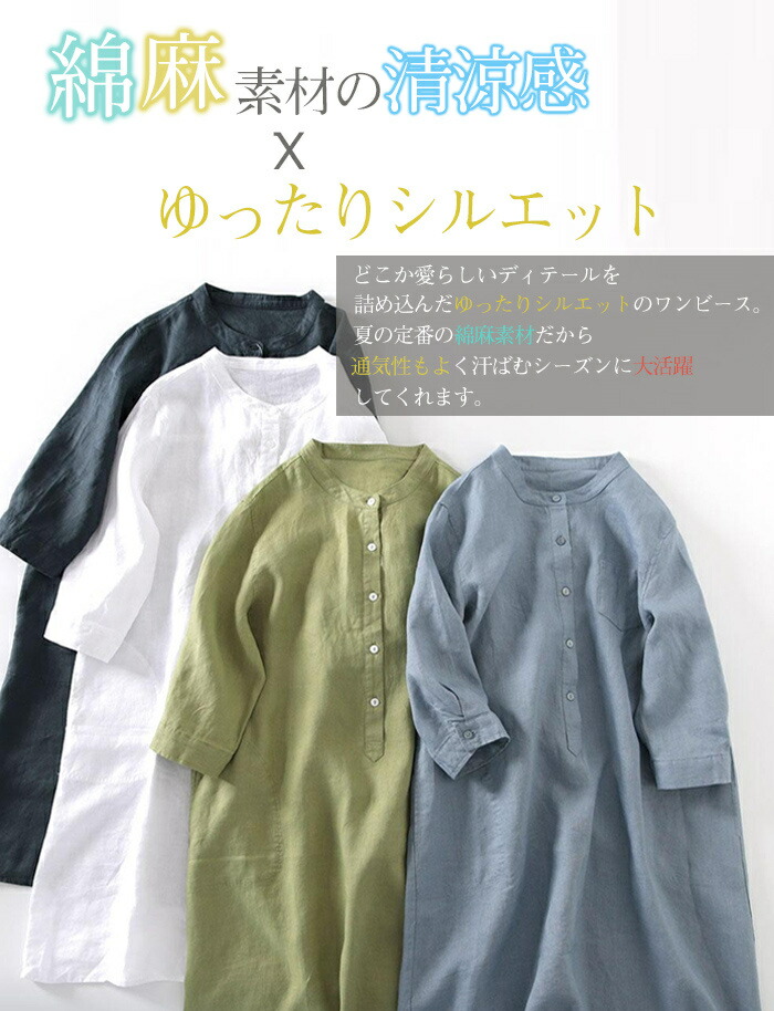 シャツワンピース ガーゼ レディース ロングワンピース 綿麻ワンピ 七分袖 シンプル 体型カバー マキシ丈 ゆるっと ミモレ 無地 春 夏 カジュアル 綿麻 ナチュラル 大人可愛い 黒 白 プレゼント
