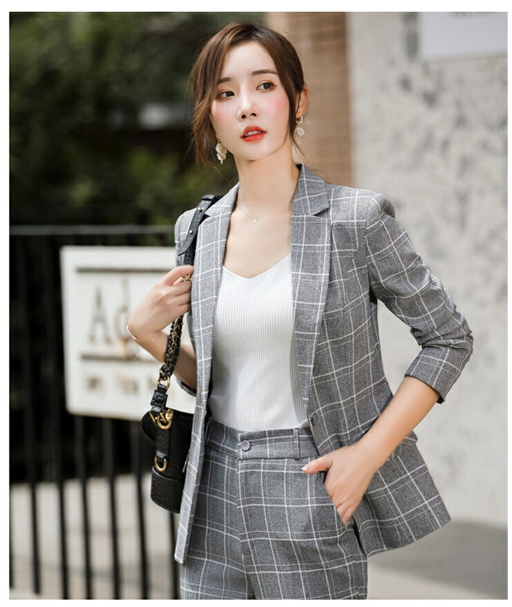 レディーススーツ チェック柄 スリム 通勤スーツ カジュアルスーツ レディース 2点セット ジャケット+パンツ おしゃれ ビジネス オフィス OL 韓国風 通勤OL 一つボタン 上下セット エ 着やせ