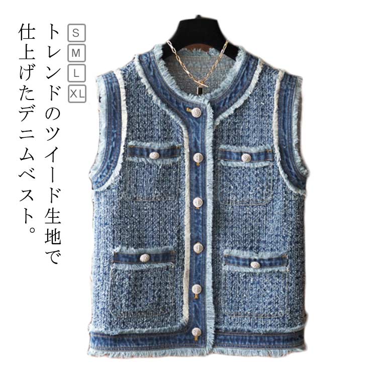 ジレ ゆったり ツイードベスト 重ね着 カジュアル エレガント アウター 春秋 羽織 フリンジ ベスト 前開きベスト デニムベスト かわいい 卒業式 おしゃれ 上品 入園式 母 卒 きれいめ