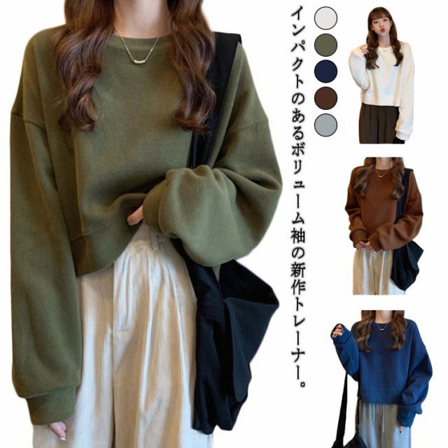 スウェット レディース トップス カジュアル トレーナー プルオーバー クロップド丈 ショート丈 ボリューム袖 春 秋 お洒落 20代 30代 冬
