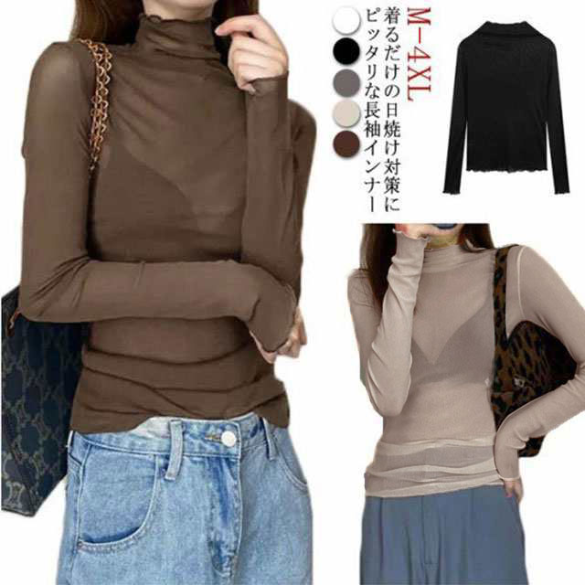 ~4 ボトルネック シアートップス 紫外線対策 長袖 薄手 インナー